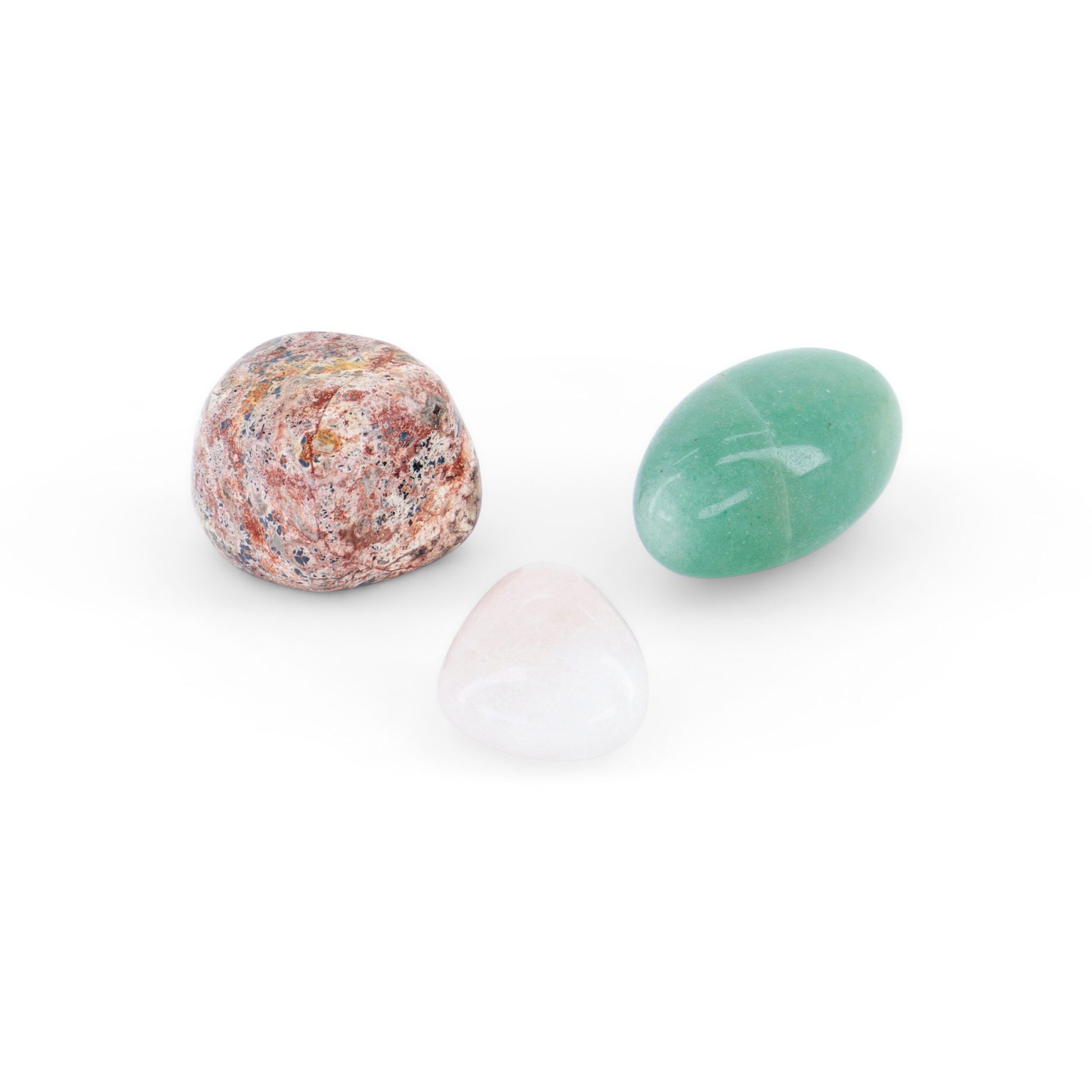 - Crystals for love and balance: Rose Quartz, Rhodonite, Green Aventurine